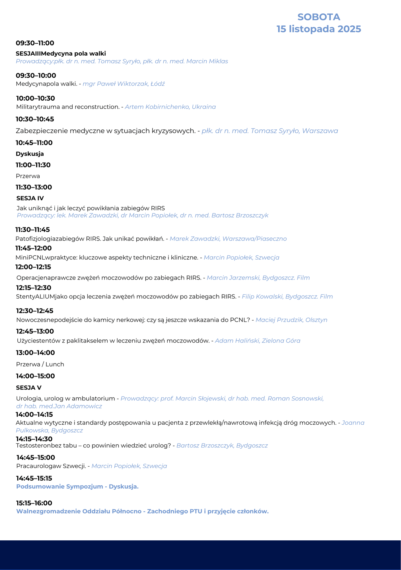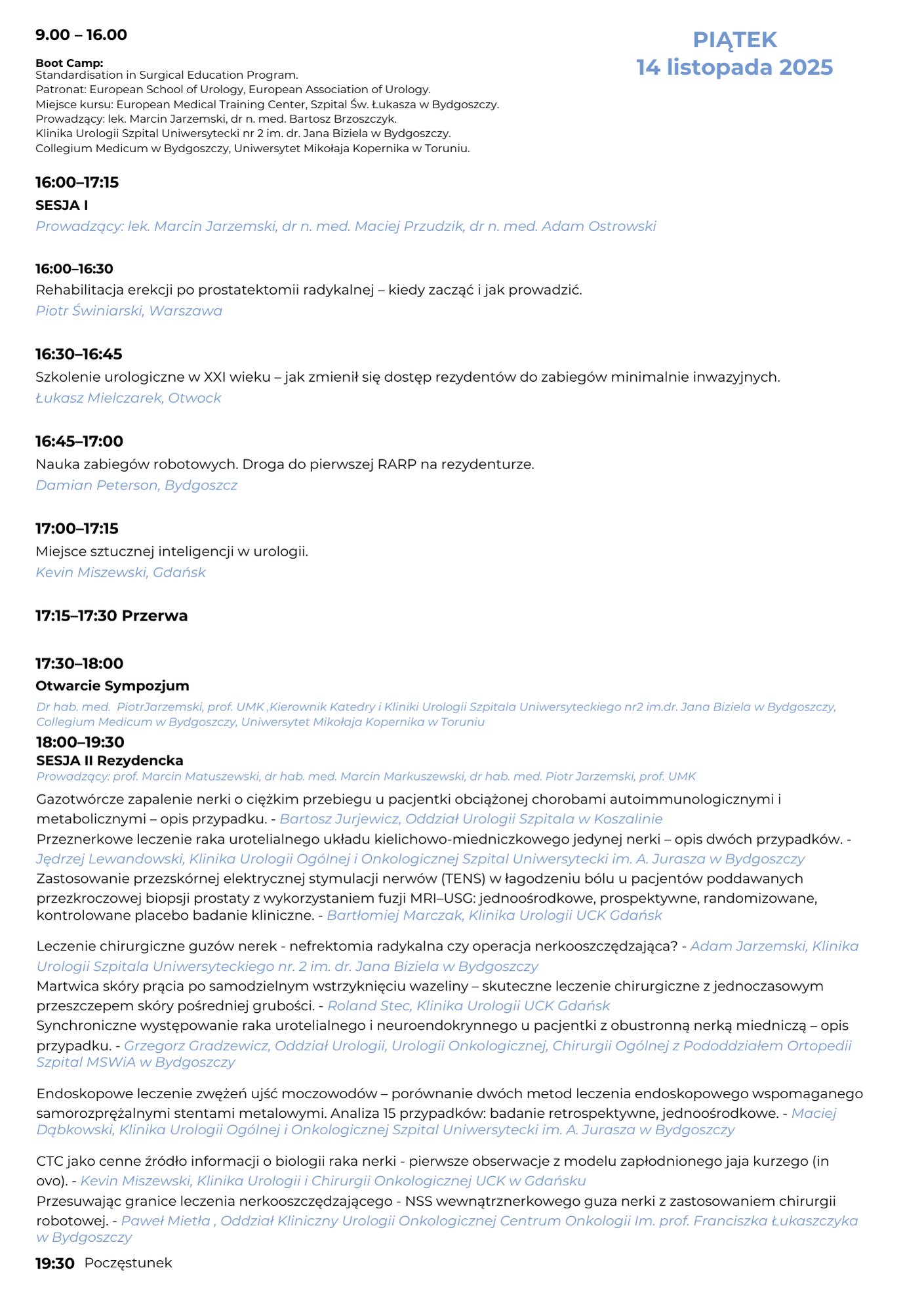 Sympozjum odbędzie się 14–15 listopada w Bydgoszczy (Hotel City). W programie przewidziano Urology Boot Camp, sesje rezydenckie oraz wykłady poświęcone nowoczesnemu szkoleniu (robotyka, AI), rehabilitacji erekcji po prostatektomii i praktyce urologa w różnych systemach ochrony zdrowia. Drugi dzień obejmie m.in. blok o medycynie pola walki, rekonstrukcji urazów oraz rozbudowaną sesję o technice RIRS z akcentem na zapobieganie i leczenie powikłań, filmy operacyjne i dyskusję o wskazaniach do PCNL. Zaplanowano też część „Urolog w ambulatorium” – aktualne wytyczne w nawracających ZUM, testosteron w praktyce, implantację protezy prącia oraz nowe możliwości immunoterapii w raku pęcherza. Wydarzenie zakończy walne zgromadzenie oddziału.